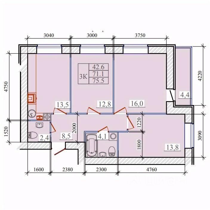 Общая площадь75,5 м2