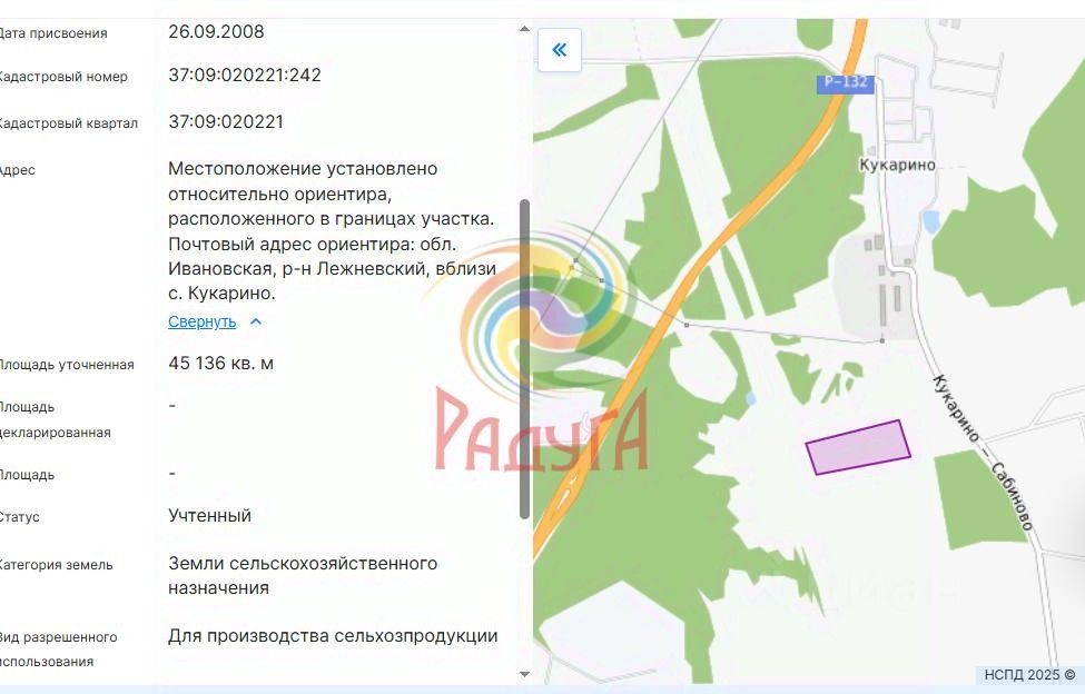 Лот:6210. Продаётся участок - 451 сотка плодородной земли. Почва подходит для выращивания овощей, фруктов, ягод и зерновых культур. Возможности использования земельного участка не ограничены: - Создание собственной фермы и выращивание экологически чистых продуктов питания. - Разведение крупного рогатого скота, лошадей, овец или птицы. - Организация питомника декоративных растений или цветов. - Строительство эко-отеля или базы отдыха с собственным производством продукции. - Создайте собственную сыроварню, винодельню или производство органических соков. (Работая в аграрном секторе, вы имеете возможность покупать жилье по сельской ипотеке-3%) Удобства и инфраструктура рядом: Расположение участка: рядом с п. Кукарино. Направление Кукарино-Сабиново (асфальтовая дорога). Также трасса М-7 Иваново-Москва