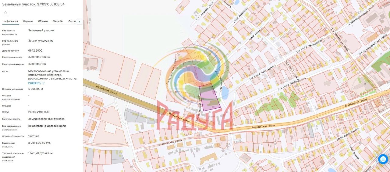 Площадь: 5 365 м (54 сотки) Категория: Промышленного назначения (зона П-1) Коммуникации: Газ по границе участка, возможность подключения электричества и центральной воды Подъезд: Асфальтированные дороги, заезд с двух сторон (ул. Октябрьская и ул.