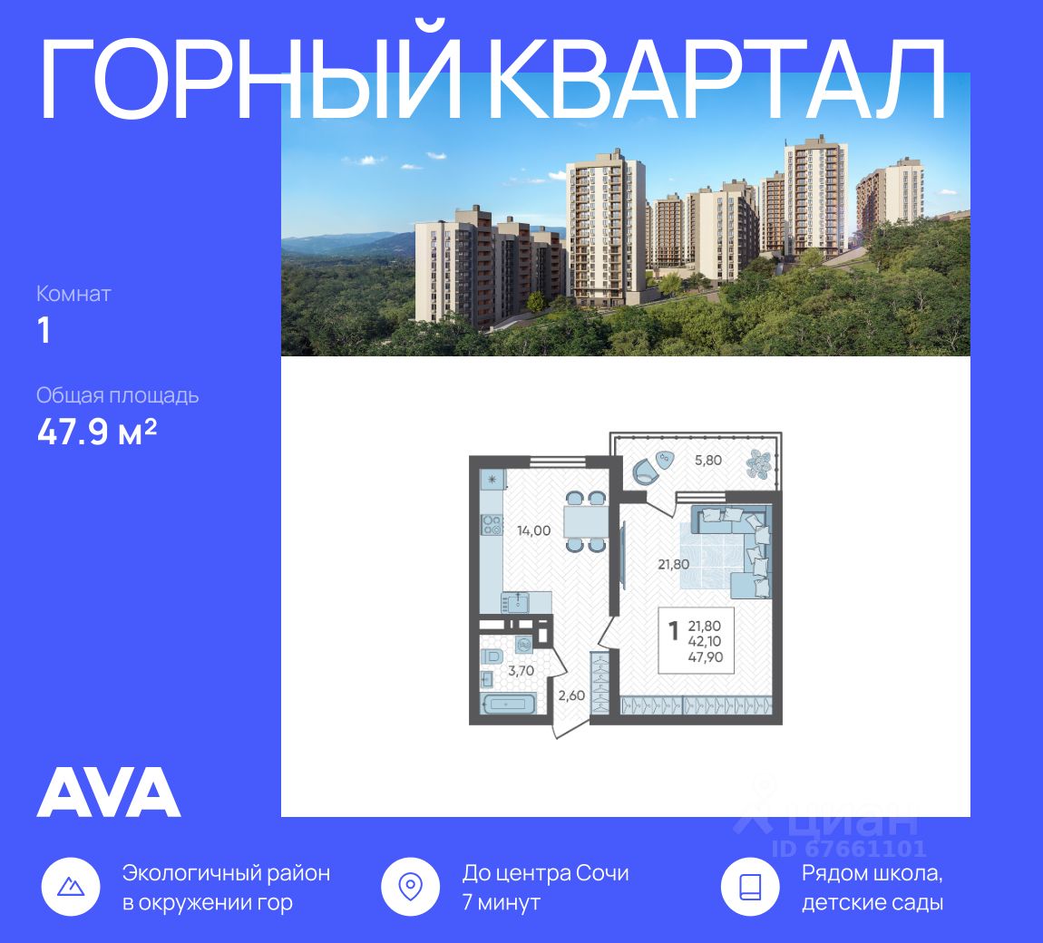 Продается 1-комнатная квартира в доме (Литер 5), срок сдачи : 3 кв. 2026, общей площадью 47.9 кв.м., на 2 этаже в новом современном жилом комплексе в Сочи ''Горный квартал'', Хостинский район. Отличный вариант для инвестиций и жизни.