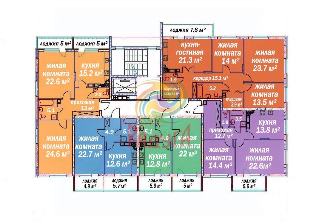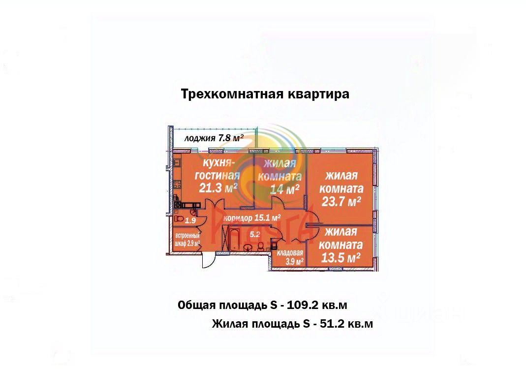 Просторная планировка 109,2 м: 3 изолированные комнаты (51,2 м) Кухня-гостиная 21,3 м 2 современных санузла Удобная кладовая 3,9 м Просторная лоджия 7,8 м