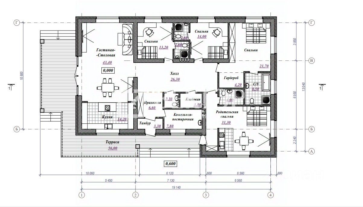 Детально продуманная планировка: -Общая площадь 246 м2 -Большая кухня-гостиная-57,6 м2, выход на террасу с панорамным остеклением -2 изолированные спальни со своими санузлами -2 спальни с санузлом и гардеробной -просторная прихожая с гостевым санузлом и гардеробной -котельная-прачечная -входная группа